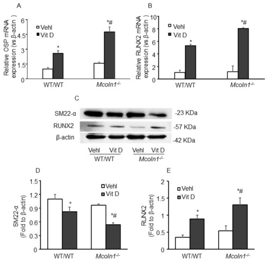 mRNA and protein expression of phenotypic switch markers in Vit D-treated Mcoln1−/− mice. The bar graph shows significantly increased aortic mRNA expression of osteogenic markers (A) OSP and (B) RUNX2 in Mcoln1−/− mice receiving Vit D injections as compared to wild-type littermates. n = 3–4. (C) Representative Western blot analysis showing the effects of Mcoln1 gene deletion on SM22-α and RUNX2 protein expression. Summarized data show the changes in the protein expression of (D) SM22-α and (E) RUNX2. (n = 3–4). Data are shown as mean ± SEM of values. Vehl: Vehicle; Vit D: vitamin D; OSP: Osteopontin; RUNX2: Runt-related transcription factor 2. * p ˂ 0.05 vs. WT/WT Vehl; # p ˂ 0.05 vs. WT/WT Vit D group.