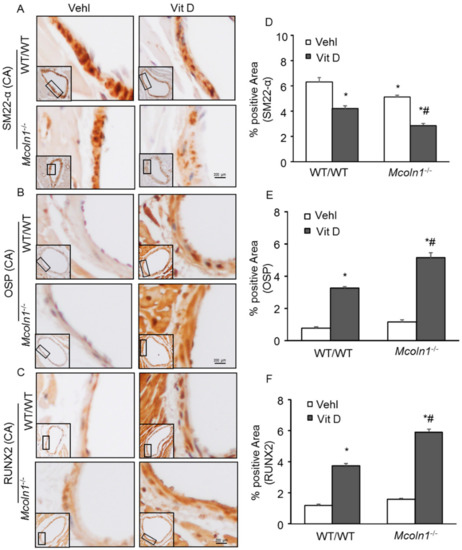 Phenotypic switch of smooth muscle cells (SMCs) in the aortic media in Vit D-treated Mcoln1−/− mice. Representative aortic photomicrographs depict arterial medial calcification (AMC) associated with (A,D) decreased expression of SM22-α (brown stain) (n = 5–6); (B,E) increased expression of OSP (n = 6); and (C,F) RUNX2 (n = 6) (brown stain) in the aortic media of Mcoln1−/− mice receiving Vit D injections as compared to wild-type littermates. Data are shown as mean ± SEM of values. Vehl: Vehicle; Vit D: vitamin D; OSP: Osteopontin; RUNX2: Runt-related transcription factor 2. * p ˂ 0.05 vs. WT/WT Vehl; # p ˂ 0.05 vs. WT/WT Vit D group.