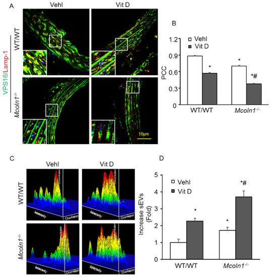 Lysosome–multivesicular body (MVB) interaction and small extracellular vesicle (sEV) release in Vit D-treated Mcoln1−/− mice. (A) Representative confocal pictures reveal co-localization of MVB (VPS16; green) and lysosome (Lamp-1; red) in aortic medial SMCs (B) Bar graph shows significant decrease in co-localization of VPS16/Lamp-1 in Vit D-treated Mcoln1−/− mice as compared to wild-type littermates. n = 5–6. (C) Representative 3D graphs depicting number of sEVs isolated from plasma from wild-type and Mcoln1−/− mice with vehicle and Vit D treatment. (D) Summarized bar graph shows changes in sEV number (50–150 nm) under vehicle and Vit D treatment. n = 5–7. Data are shown as mean ± SEM of values. Vehl: Vehicle; Vit D: vitamin D; PCC: Pearson correlation coefficient. * p ˂ 0.05 vs. WT/WT Vehl; # p ˂ 0.05 vs. WT/WT Vit D group.