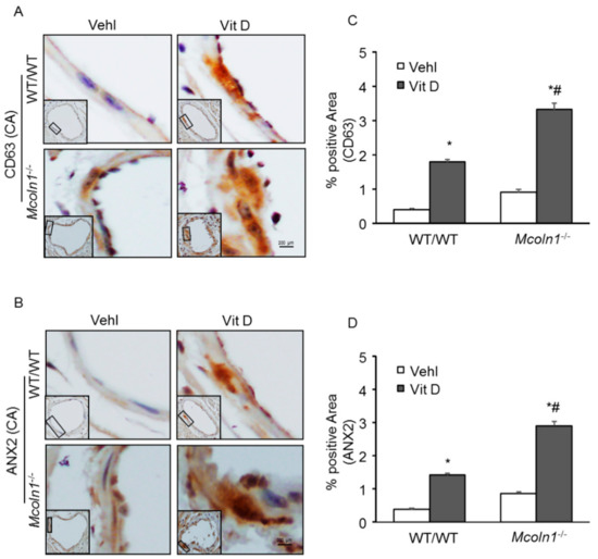Localization of sEV markers in coronary arterial wall in Vit D-treated Mcoln1−/− mice. Representative photomicrographs show immunostaining of sEV makers in coronary arterial wall. (A) CD63 and (B) AnX2 staining are observed as brown signal in the coronary arterial wall. The summarized bar graph shows % positive area of (C) CD63 and (D) AnX2 positive staining in coronary arterial wall. Data are shown as mean ± SEM of values. n = 5–6. Vehl: Vehicle; Vit D: vitamin D; AnX2: Annexin-II; PCC: Pearson correlation coefficient. * p ˂ 0.05 vs. WT/WT Vehl; # p ˂ 0.05 vs. WT/WT Vit D group.