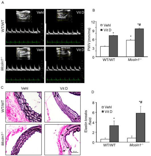 Effect of Mcoln1 gene deletion on arterial stiffness in Vit D-treated Mcoln1−/− mice. (A) Representative Doppler images show Doppler velocity signals. (B) The summarized bar graph shows significantly increased PWV in Mcoln1−/− mice as compared to wild-type littermates under vehicle conditions as well as with Vit D treatment. n = 5–6. (C) Representative elastin staining images of aortic sections show breaks in elastic fibers (marked by arrows). (D) The bar diagram shows number of elastin breaks in wild-type and Mcoln1−/− mice receiving Vit D injections. Data are shown as mean ± SEM of values. n = 6. Vehl: Vehicle; Vit D: vitamin D. * p ˂ 0.05 vs. WT/WT Vehl; # p ˂ 0.05 vs. WT/WT Vit D group.