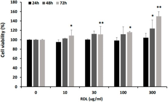 The effect of various concentrations of RDL on the viability of human keratinocyte HaCaT cells. Exponentially growing HaCaT cells were plated onto 24-well plate and treated with indicated various concentrations (0–300 μg/mL) of RDL for 24, 48 and 72 h. The viability was measured by MTT assay as described in the materials and methods. The results were expressed as the mean ± SD of three experiments. Significant difference from control group, * p < 0.05 and ** p < 0.01.