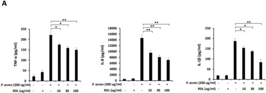 In order to assess the effects of RDL on P. acnes-associated inflammatory changes, ELISA (Figure 3A) and Western blot (Figure 3B,C) analyses were employed to analyze the expression of proinflammatory cytokines. As shown in Figure 3A, upon treatment of P. acnes, the secretions of TNF-α, IL-8 and IL-1β significantly increased in HaCaT cells, while treatment with RDL significantly suppressed the P. acnes-induced TNF-α, IL-8 and IL-1β production. To further investigate the effect of RDL on P. acnes-induction of cytokines, protein expressions of these cytokines were evaluated by Western blot analysis. As shown in Figure 3B, P. acnes strongly augmented the expressions of TNF-α, IL-8 and IL-1β, whereas RDL treatment dramatically suppressed the induction of those gene expressions in P. acnes-treated cells. Since TLR activation may lead to the production of inflammatory cytokines, further Western blot analysis was performed on HaCaT cells. As observed in Figure 3C, RDL dose-dependently suppressed P. acnes-induced TLR2 expression. These results indicate that RDL specifically inhibits the expression of inflammatory cytokines and TLR induced by P. acnes in HaCaT cells.