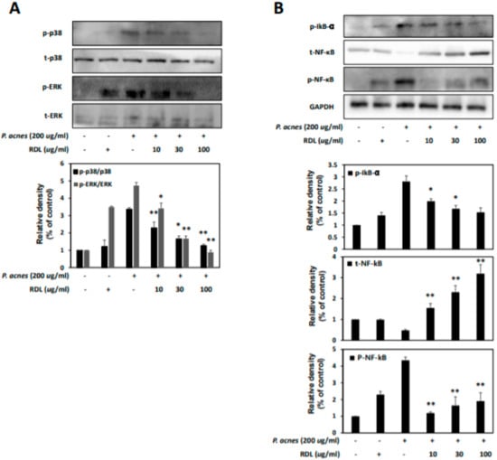 RDL suppresses the MAPK and NF-κB signaling pathway in P. acnes–treated HaCaT cells. HaCaT cells were incubated for 24 h without P. acnes and with P. acnes alone, or with P. acnes in the presence of RDL. (A) The effects of RDL on MAPKs, such as P38 and ERK phosphorylation, in HaCaT cells. P38 and ERK were quantified with ImageJ. (B) Effects of RDL on phosphorylation of IkB and NF-κB after P. acnes treatment of HaCaT cells. Western Blots were quantified using densitometry and normalized to total protein and GAPDH. p-IκB, NF-κB and p-NF-κB were quantified with ImageJ. Data were expressed as the mean ± SD three independent experiments. * p <0.05 and ** p <0.01 compared to the P. acnes only treatment.