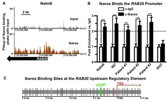 Ikaros binding in the RAB20 URE. (A) ChIP-seq signal map for Ikaros binding to the RAB20 promoter in the Nalm6 B-ALL cell line. (B) qChIP analysis of Ikaros occupancy at the RAB20 promoter in human B-ALL cell lines, primary human B-ALL cells, and Ikaros-null HEK293T cells. The graphed data is the mean ± SD (error bars) from three independent experiments. (C) Schematic diagram of Ikaros consensus binding motifs (–GGGA– and –GGAA–) in the human RAB20 upstream regulatory element (grey vertical lines). The green line marks the site that was analyzed by qChIP and the TSS is marked by the red arrow.