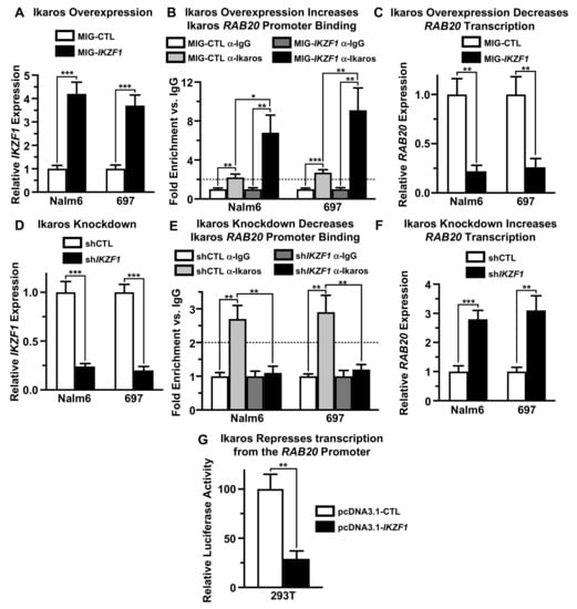 The RAB20 gene encodes the Rab20 small GTPase, a protein shown to be involved in regulating cellular proliferation, cell metabolism, and inflammation. DNA sequence analysis of the RAB20 promoter identified a strong Ikaros consensus binding site located in close proximity to the transcriptional start site of RAB20 and within the Ikaros peak detected by ChIP-seq. The RAB20 promoter contains a large number of core Ikaros consensus DNA binding sequences (–GGGA– or –GGAA–) in close proximity to each other (Figure 1C). Since Ikaros binds with higher affinity to DNA sequences that contain two core consensus Ikaros binding sites within 40 bp, these data indicated that the RAB20 promoter has several high-affinity Ikaros binding sites. This suggests that Ikaros occupancy at the RAB20 promoter has strong functional significance in cellular metabolism.