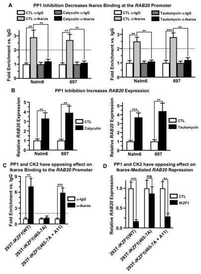 Ikaros is a substrate for PP1. The Ikaros protein contains a consensus binding site for PP1, which is essential for Ikaros-PP1 interaction and for dephosphorylation of Ikaros by PP1 [54]. Since the treatment of B-ALL cells with a specific PP1 inhibitor, tautomycin, strongly affects Ikaros binding to the RAB20 promoter and repression of RAB20 transcription, we tested whether the interaction between Ikaros and PP1 affects the ability of Ikaros to repress RAB20. The wild-type Ikaros or the Ikaros mutant that contains alanine point mutations at amino acids 465 and 467 that disrupt Ikaros–PP1 interactions (IKZF1-465-7A) was transfected into 293T cells, and the effect of the Ikaros–PP1 interaction on Ikaros’ function in regulating RAB20 expression was analyzed. The results showed that inhibition of PP1 interaction with Ikaros (IKZF1-465-7A) results in the loss of Ikaros binding to the promoter of the RAB20 gene compared to the wild type Ikaros, as measured by qChIP (Figure 5C panels 1 and 2). Unlike wild-type Ikaros, the IKZF1-465-7A mutant had no effect on RAB20 transcription (Figure 5D, panels 1 and 2). These data showed that PP1 regulates RAB20 expression, and that the direct interaction of Ikaros with PP1 is essential for Ikaros binding to the promoter of the RAB20 gene and for repression of RAB20.