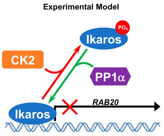 Protein phosphatase 1 can function as a tumor suppressor in human malignancies [58,59,60,61]. PP1 was reported to directly bind the PP1 consensus binding site at the C-terminal end of the Ikaros protein. The role of PP1 in the control of Ikaros function in regulating gene expression has not been extensively studied, and the transcription of only one gene, terminal deoxynucleotidetransferase (TdT), was reported to be regulated by PP1 via Ikaros dephosphorylation [63]. Dephosphorylation of Ikaros by PP1 increases Ikaros’ DNA-binding affinity, its protein stability, and its ability to function as a transcriptional regulator [54]. The presented data using mutant Ikaros that is unable to interact with PP1 showed that PP1 is a critical regulator of Ikaros’ ability to control RAB20 transcription and that PP1 directly counteracts CK2 effects on RAB20 transcription. Thus, the presented data demonstrate the opposing effects of CK2 and PP1 on Rab20 function via control of Ikaros activity as a regulator of Rab20 expression (Figure 6).