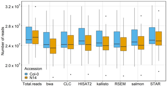 After pre-processing, the resulting dataset contained 36 samples [17] with a sequencing data size ranging from about 21 to almost 33 × 106 reads (Table A1). In general, a high fraction of the total reads was mapped for both accessions. The mapping for Col-0 was slightly better than for N14 (Figure 2) with mapped reads between 95.9% (bwa) and 99.5% (STAR). For N14 between 92.4% (bwa) and 98.1% (STAR) of the reads were mapped against the respective reference sequence of Col-0 (Table A2).