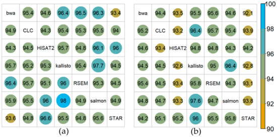 The percentage of overlapping DGE (control vs. cold acclimated) identified by each pair of mappers was analyzed in both directions using DESeq2 [18] in all cases and was plotted in an asymmetric matrix. For Col-0 (Figure 5a) kallisto and salmon yielded a large overlap of DGE of 98% (kallisto vs. salmon) and 97.7% (salmon vs. kallisto). For N14 (Figure 5b) slightly smaller overlaps were detected, but also here salmon and kallisto (97.6% and 96.4%) yielded the largest overlap. On the other hand, for both Col-0 and N14 the lowest overlaps were detected for bwa and STAR (93.4% and 92.1%, respectively). In general, a smaller overlap of DGE between 92% and 94% was identified for the comparisons of STAR and HISAT2 with the remaining five mappers.