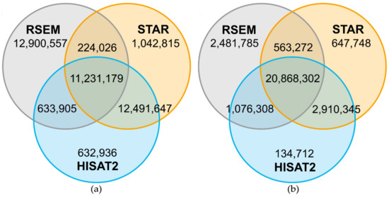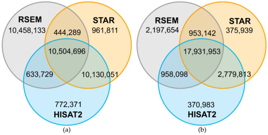 Number of reads mapping on the same genomic position comparing HISAT2, RSEM and STAR for N14. Venn diagrams are based on 22,040,847 reads mapped by all three mappers and represent the overlap of mapped reads on the same genomic position for sample B (see Table A3 for sample information). A high number of the uniquely mapped reads in RSEM was based on soft-clipping by one bp performed by HISAT2 and STAR (a). The reads in HISAT2 and STAR were corrected by adding the soft-clipped bp back and the overlap with RSEM increased strongly (b).