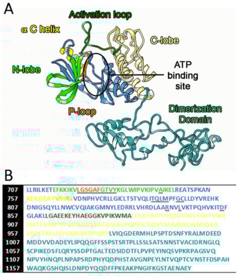The complete structure of wild type EGFR cytoplasmic tyrosine kinase (TK) domain after molecular dynamic (MD) simulation (A) and the corresponding FASTA sequence (B). For clarity, we reported the same color index on both figures, while the underlined aminoacids make up the ATP binding site.