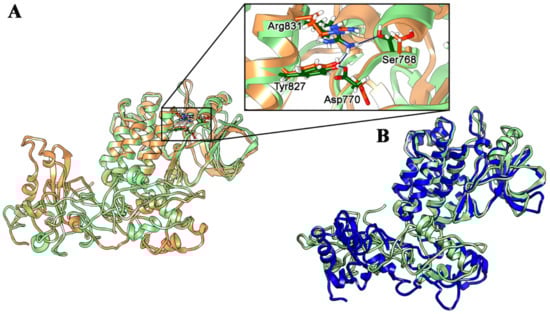 H-bond interactions of Ser768, Asp770, Tyr827 and Arg831 residues in the T790M/L858R EGFR domain. We reported the structure at the beginning (orange) and at the end (green) of MD simulation (A). Superimposition of T790M/L858R (green) and ELREA deletion (blue) EGFR structures in the corresponding closed conformations (B).