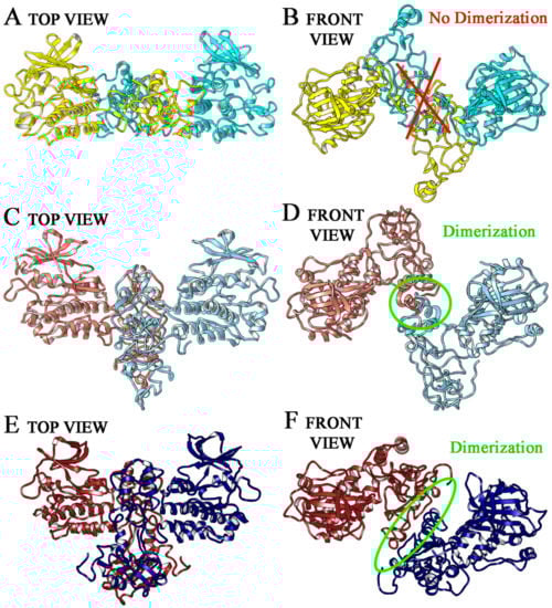 To confirm that the D-domain orientation can lead to the constitutive activation of T790M/L858R EGFR, or any of the other EGFR forms, a comparison of our models with the activated dimeric structure of another TK receptor (pdb code: 6ewx []) was carried out. This structure contains two TK domains in dimeric association, corresponding to the activated state. In particular, we used this model to compare our EGFR monomers and evaluate the capability of the three MD-stabilized EGFR forms to associate in a stable dimeric complex. To do this, a three dimensional fitting between 6ewx and EGFR in different form was carried out through a superimposition match, evaluating the root-mean-square deviation (RMSD) between 6ewx and EGFR structures. For the wild type model, the RMSD value obtained from superimposition with 6ewx was 1.01 Å. For wt EGFR, the orientation of the D-domain sterically prevented an efficient interaction between the two monomers (Figure 4A,B) along the MD trajectory, in which it retained always an inactive conformation (no constitutive activation, in agreement with literature data). On the contrary, as already anticipated in the previous paragraph, for T790M/L858R model an RMSD value of 0.87 Å respect 6ewx file was found, and after 80 ns of simulation the D-domain adopted a stable bended conformation, which allowed to two monomers to efficiently couple and form a stable dimer complex (Figure 4C,D). These results support the hypothesis that the specific movement of the Nlobe of the TK domain and the spatial bended orientation of the D-domain induce the constitutive activation of T790M/L858R EGFR receptor. A dimer complex was also observed for ELREA deletion form, in which an RMSD value of 0.98 Å respect 6ewx file was found, and a large part of the D-domain was oriented to allow a discrete amount of connections between aminoacids of the two monomers (Figure 4E,F). The substantial difference with respect to the T790M/L858R mutated form concerns the fact that albeit sterically possible, no highly specific interactions between amino acids were observed; this means that even if deletion favor a receptor conformational rearrangement in a closed form, the resulting activation is not so strong as for the double mutated receptor.