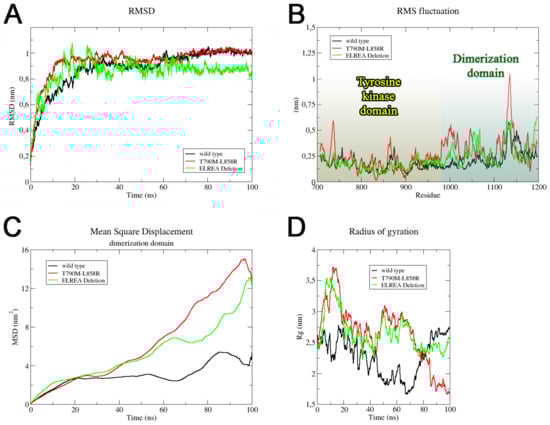Structural analysis of EGFR cytoplasmic different forms. We reported root-mean-square deviation (RMSD) (A), root-means-square fluctuation (RMSF) (B), mean square displacement (MSD) of the dimerization domain (C) and radius of gyration (Rg) (D), For all graphs we reported the wild type, the T790M/L858R and ELREA deletion forms (black, red and green, respectively).