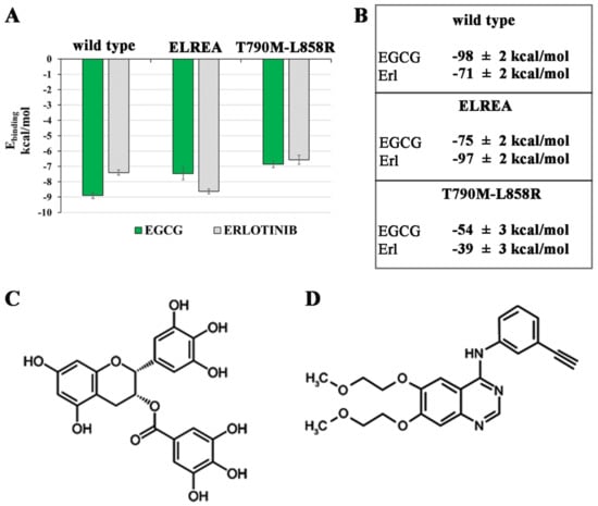 Binding energy of Epigallocatechin-3-gallate (EGCG) and Erlotinib in association of wild type, ELREA deletion and T790M/L858R mutated EGFR forms obtained with the molecular docking (A) and molecular dynamics approach (B). We reported the total MM/PBSA energy calculated in the last 5 ns of MD simulation in kcal/mol.; 2D structure of EGCG (C) and Erl (D).