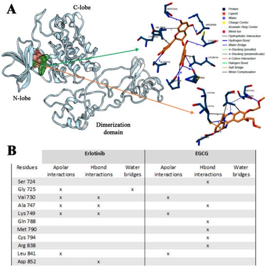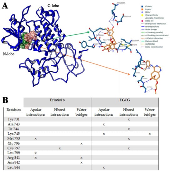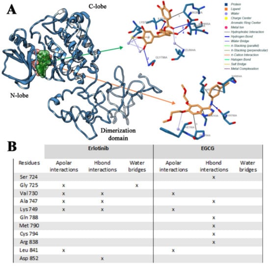 The presence in the ATP binding pocket of a high number of purely apolar residues makes the hydrophobic interactions the main binding force for the stabilization of the Michaelis complex; however, the presence of polar groups increases the affinity and specificity of these ATP competitive inhibitors. Both Erlotinib and Epigallocatechin-3-gallate share two opposite chemical physical features (hydrophobic/polar moieties) that fully characterize them as “typical” EGFR competitive inhibitor of ATP binding site (Figure 6). The summary of binding energy obtained with the dynamic molecular docking approach is shown in Figure 6A.