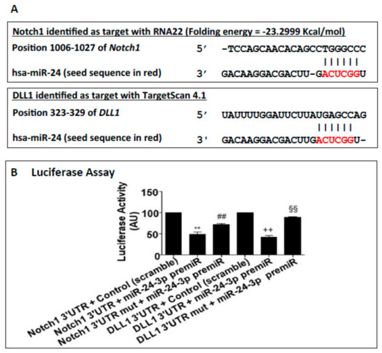Figure 1. Target-gene prediction and primers sequences: (A) Analysis of the seed sequence of miR-24-3p (red letters) in the 3′-UTR of Notch1 and Dll1 with RNA22 software and Targetscan 4.1. Gray part: binding strength. (B) To validate the relation between miR-24-3p and the predicted targets, the luciferase assay was performed. HEK293 cells were transfected with pre-miR-24-3p or control and the reporter gene for Notch1 3′-UTR or Dll1 3′-UTR or their respective mutants. Experiments were performed in triplicate and repeated three times. Values are means ± SEM. ** p < 0.001 vs. Notch1 3′-UTR + control; # # p < 0.01 vs. Notch1 3′-UTR + pre-miR-24; ++ p < 0.05 vs. Dll1 3′-UTR+ control; $$ p < 0.01 vs. Dll1 3′-UTR + pre-miR-24.