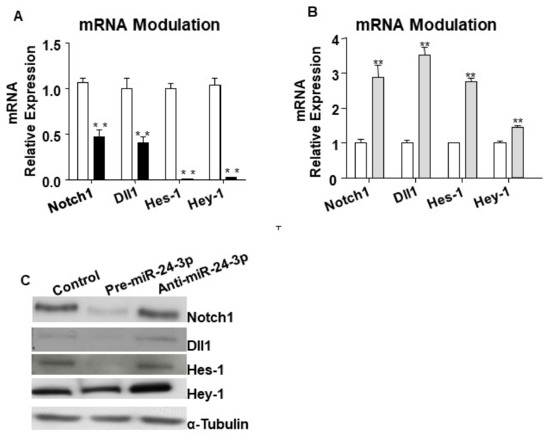 Figure 2. Notch1 and Dll1 direct targets of miR-24-3p and Notch pathway modulation in human umbilical vein endothelial cells (HUVECs). To validate the relation between miR-24-3p and the predicted targets Notch1 and Dll1, mRNA and proteins analyses were performed in HUVECs transfected with premiR-24-3p, anti-miR-24-3p, or control. Hes-1 and Hey-1 were also evaluated, as reporters of the Notch signalling activity. Bar graph (A) shows HUVEC transfected with pre-miR-24-3p (black columns) compared to control (scramble, white columns). Bar graph (B) shows HUVEC transfected with miR-24-3p inhibitor (light grey columns) compared to control (white columns). mRNA levels were normalised to 18S and quantified employing the 2ΔΔCt method and is presented as changes from the values in the respective control group. Experiments were performed in triplicate and repeated three times. Values are means ± SEM. Τ ** p < 0.01 vs. Notch1 3′-UTR + control. Panel (C) shows protein expressions of Notch1, Dll1, Hes-1, and Hey-1 forcing and inhibiting the expression of miR-24-3p. For Western blot analyses, α tubulin was used as house-keeping protein.