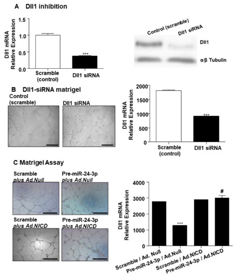 Figure 3. Dll1 inhibition in HUVECs affects the network-formation capability, while Notch intracellular domain (NICD) over-expression rescues this angiogenic defect. (A, left) Bar graph shows Dll1 mRNA expression in HUVECs transfected with Dll1-siRNA (black column) compared to HUVECs transfected with scramble sequence (control). (A, right) Western Blot shows the Dll1 protein expression in HUVECs transfected with Dll1-siRNA compared to HUVECs transfected with scramble sequence (control). α-β Tubulin is presented as house-keeping protein. (B, left) Photomicrographs of representative fields show the endothelial networks formed by HUVECs transfected with Dll1-siRNA compared to control group. (B, right) Bar graph represents the quantification of the total length of cord-like structures formed by HUVECs transfected with Dll1-siRNA (black column) compared to control group (scramble, white column). (C, left) Photomicrographs of representative fields show the endothelial network formed by HUVECs differently treated as indicated: HUVECs transfected with scramble and infected with Ad.Null; transfected with pre-miR-24-3p miR-24-3p and infected with Ad.Null; transfected with scramble and infected with Ad.NICD; and HUVECs transfected with pre-miR-24-3p and infected with Ad.NICD. Bar graph (C) represents the photomicrographs’ conditions expressing the total length of tube-like structures. Dll1 mRNA expression was normalised to 18S. Experiments were performed in triplicate and repeated three times. Values are means ± SEM. *** p < 0.001 vs. Scramble in A nd B) and vs. Scramble/Ad.Null (in C); # p < 0.05 vs. Pre-miR-24-3p/Ad.Null (in C).
