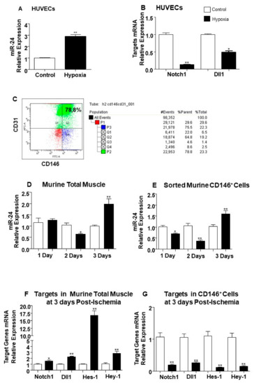 Figure 4. Modulation of miR-24-3p, Notch-1, and Dll1 mRNA expression by in vitro hypoxia and limb ischemia. (A) Bar graph shows miR-24-3p expression changes induced in endothelial cells (ECs) by culture for 48 h in hypoxia (1% O2, black column) versus standard cell culture conditions (21% O2, white column). (B) Bar graph shows Notch1 mRNA and Dll1 mRNA modulation by hypoxia in the same cells preparations used for the analyses shown in Panel A. (C) FACS analysis plot shows murine sorted CD146+ cells stained with FITC-conjugated CD146, APC-conjugated CD31 antibodies. The cells were extracted from pools of two adductor muscles. (D) Bar graph shows miR-24-3p expressional changes in murine total muscle samples at 1, 2, and 3 days post-ischemia (black columns) compared to murine non-ischemic control samples at matched time-point (white columns). (E) Bar graph shows miR-24-3p modulation in murine ECs sorted from total adductor muscle samples at 1, 2, and 3 days post-ischemia (black columns) compared to contra-lateral non-ischemic samples (white columns). (F) Bar graph shows miR expressional changes in Notch1, Dll1, Hes-1, and Hey-1 in mouse muscle harvested at 3 days post-ischemia (black column) compared to contra-lateral non-ischemic samples (white column). (G) Bar graph shows mRNA expression changes in Notch1, Dll1, Hes-1, and Hey-1 in murine ECs sorted from adductor muscle at 3 days post-ischemia (black column) compared to murine ECs sorted from non-ischemic muscles (white column). miR-24-3p expression was normalised to Snu6, and data are compared to the matched time-point group by the 2ΔΔCt method. Notch1, Dll1, Hes-1, and Hey-1 mRNA expression values were corrected to 18S. Experiments were performed in triplicate and repeated three times. Values are means ± SEM. *p < 0.05, **p < 0.01 vs. control matched time-point samples (n = 10 each group).