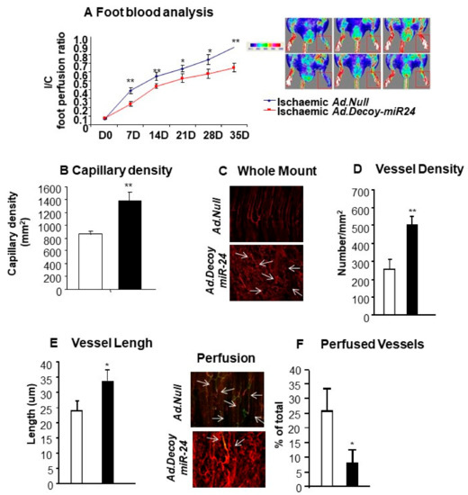 Figure 6. Effects of miR-24-3p inhibition in the ischemic limb. (A) Line graph shows the blood flow analysis in ischemic mice injected with Ad.Null (blue line) or Ad.Decoy-miR-24-3p (red line) (n = 12 animals per each group). (B) Bar graph shows increased capillary density after Ad.Decoy-mediated inhibition of miR-24-3p in the ischemic adductor muscle. Photomicrographs (C) and bar graphs (D and E) show the effect of miR-24-3p inhibition on the vascular organization (C), density (D), and length (E) in the ischemic adductor muscle. Photomicrographs and bar graph (F) show the percentage of perfused vessels in muscles treated with either AdDecoy.miR-24-3p or Ad.Null at 21 days of ischemia. Ad.Decoy.miR-24-3p treatment is shown in black, Ad.Null in white. Values are means ± SEM. ** p < 0.01 and * p < 0.01 vs. Ad.Null.