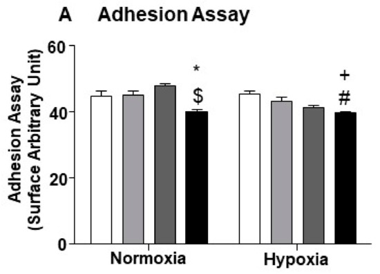 Figure 9. Reduced miR24 in ECs affects the adhesion between ECs and pericyte. miR-24-3 under standard (5% O2) or hypoxic culture conditions. Groups are pre-miR-24-3p transfected ECs miR-24-3p (black column); scramble control (dark grey column); vehicle control of transfection (light grey); and untreated cells (white column). Adhesion assay was performed using five wells per treatment and repeated two times. Values are means ± SEM. * p < 0.05 vs. untreated cells in normoxia; + p < 0.05 vs. untreated Cells in hypoxia; $ p < 0.05 vs. scramble in normoxia; # p < 0,05 vs. scramble control in hypoxia.