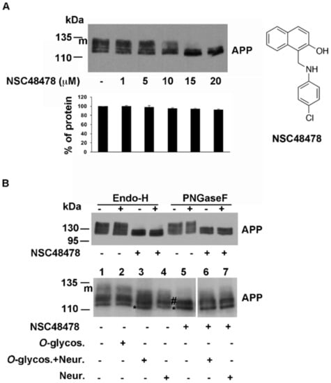 To understand why APP resulted resistant to PNGaseF digestion and whether the mature APP (mAPP) and the intermediate bands (#) derive from N-glycosylation events, we employed tunicamycin (Figure S1), a molecule known to prevent N-glycosylation events. According to previous observations [], treatment of GT1 cells with tunicamycin for 16 h (Figure S1) revealed that the mature APP (mAPP) results from N-glycosylation modifications (and O-glycosylation, as shown in Figure 1B) and that after NSC48478 treatment (Figure S1), the resulting immature APP isoforms (* and #) were not N-glycosylated. The typically N-glycosylated PrP was carried as control of the procedure.