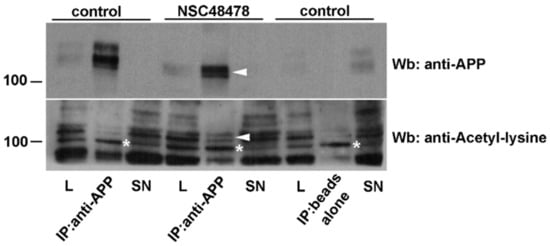 A report from Jonas M.C. et al. [], indicates that APP is a substrate of the ER-based acetylation machinery; this finding prompted us to verify this possibility. We immunoprecipitated APP from total cell lysates of GT1 cells treated (+) or not (−) with NSC48478, and analysed whether APP could be detected with an antibody against acetylated lysine. In agreement with the above-reported findings [], only the immature forms of APP were found acetylated (Figure 2, arrowheads) and the upper bands were not acetylated, which correspond to mature mAPP.