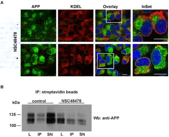 In contrast, treatment with NSC48478 revealed a dramatic change in the intracellular localization of APP in puncta scattered in the cytoplasm and in a pattern that partially resembled the typical reticular ER structures (Figure 4A). However, biotinylation assays of proteins on the plasma membrane indicate that the presence of APP on the cell surface was not prevented by NSC48478 (Figure 4B).