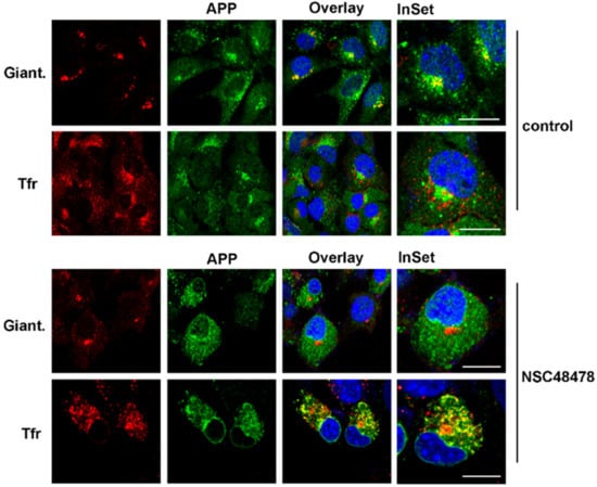 In order to characterize these structures, we employed fluorescence microscopy using different markers of intracellular organelles, finding, after NSC48478 incubation of GT1 cells, a significant colocalization of APP with the marker of the endosomal recycling compartment Tfr (Figure 5, PCC 0.89), with a concomitant loss of APP localization in the Golgi apparatus (Figure 5, compare control versus NSC48478, APP/Giantin).