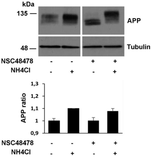 In agreement with our finding of APP in the Golgi apparatus and endolysosomes (Figure 3 and Figure 5) and previous findings describing APP transport from the Golgi to lysosomes for processing and degradation [], we found that NH4Cl treatment increased APP level respect to basal conditions (Figure 6). Under NSC48478 treatment, maturation of APP was completely rescued by NH4Cl without perturbing total APP and tubulin levels (Figure 6, bottom panel).