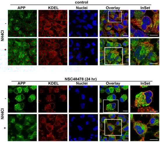 These results were corroborated by fluorescence microscopy (Figure 7 and Figure 8). Here, we show that under NSC48478 treatment, the partial ER localization of APP (Figure 7, compare upper and bottom panels) was completely rescued by NH4Cl.