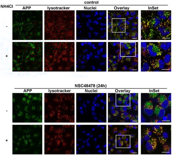 Similarly, the same experiment performed by analysing the fluorescence signal deriving from APP antibody hybridization and LysoTracker (marker of endolysosomes), revealed that NH4Cl rescued the endolysosomal localization of APP which was lost under NSC48478 treatment (Figure 8).