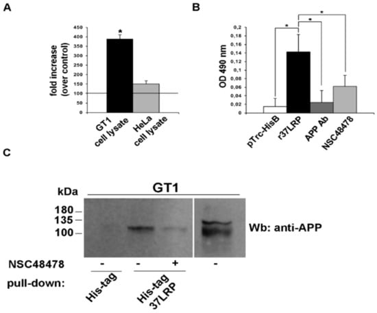 For inhibition experiments, wells pre-coated with GT1 cell lysates were incubated with 2 μg of pTrc-His B, as control, and 2 μg of r37LRP, alone and in the presence of APP antibody (1:1000), or NSC48478 compound (20 μM).