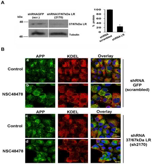 Downregulation of 37/67 kDa LR by short hairpin RNA, hampers the effects exerted by the inhibitor. (A) 37/67 kDa LR was silenced using a specific shRNA (mouse shRNA 2170) for 48 h. In comparison to shRNA 37/67 kDa LR (mouse shRNA 2170), 35 μg of total cell lysate from control cells (non-targeting RNA, shRNA GFP, scrambled) were loaded for reference. Membranes were probed with anti-37/67 kDa LR antibody to reveal the receptor. The same membranes were probed with anti-tubulin antibody followed by ECL. The amount of silenced receptor was quantified from three independent experiments (* p < 0.05). (B) Immunofluorescence analysis of scrambled or receptor silenced cells was conducted to analyse the effects of NSC48478 on APP localization. The cells were processed as in Figure 4. Colocalization analysis has been described in the methods section. Scale bars, 10 μm.