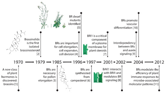 Key breakthroughs in the timeline of research on brassinosteroids [1,2,3,4,5,6,7,8,9,10,11].