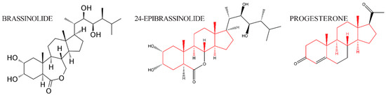 The structure of brassinolide and 24-epibrassinolide, plant steroid hormones related to animal steroid hormone progesterone. Side chains that are structurally conserved are indicated in red; side chains that differ between the hormones are in black.