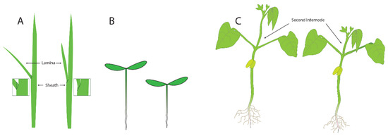 Three assays that were developed to measure the activity of BRs are shown in Figure 3: the lamina joint test (LJT) in rice, the hypocotyl elongation assay in Arabidopsis, and the second internode assay in beans. The Lamina Joint Test (LJT) (Figure 3A) was initially developed in rice as a standard growth assay for measuring auxin responses [14]. Briefly, developing rice leaves are composed of two areas separated by the joint. The distal part of the emerging leaf blade is called the lamina, and the region of the leaf that surrounds the stem is called the sheath (Figure 3A). If there is significant growth in the lamina, the leaves are more susceptible to gravity and grow at an increased angle to the main stem. If growth is repressed in the lamina, the leaves are more erect, with a smaller angle to the stem. When there is growth of the lamina, the cell length on the adaxial side (toward the stem) of the lamina is four or five times as long as the cells on the abaxial side (away from the stem) [14,15]. The LJT was also used as a microquantitative analytical assay for BL, and investigators examined the sensitivity of compounds from various cultivars and species to identify bioactive compounds. These assays showed that BL activity levels are ten-thousand-fold higher than the activity of auxin (IAA) [16]. Subsequently, new analogs of BL were isolated and identified from many kinds of plants using this bioassay [17]. For example, the beginning of BR research in Japan was initiated with research on Distylium (winter hazel, related to witch hazel) factors, which were discovered in rapidly expanding galls induced by aphids in Distylium racemosum leaves. These factors, when assayed using the LJT and characterized biochemically, were found to be BRs, as expected [18].