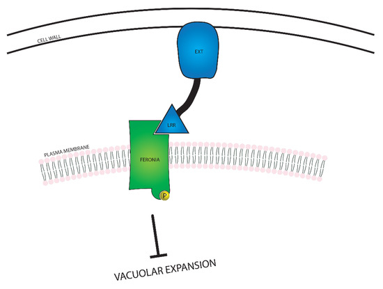 In addition to suppressing cell expansion from the plasma membrane, FERONIA is also involved in several intracellular processes related to cell growth, including expansion of the large vacuole found in plant cells, and modulation of BR responsiveness. FERONIA regulates vacuolar size through interactions with Leucine-Rich Repeat Extensin (LRX) proteins, as seen in Figure 5. The LRX proteins are located between the plasma membrane and the cell wall, and the EXT domain interacts with the cell wall. The LRR domain binds to FER and acts as a conduit between FER and the cell wall, communicating the constraint of the cell wall [77]. Interaction between FERONIA and LRX causes FERONIA to become phosphorylated and suppress vacuolar expansion through a mechanism yet to be discovered. As the largest plant organelles, vacuoles contribute substantially to cellular expansion; due to their ability to fill space within the cell, vacuolar expansion allows for swift elongation by reducing the cell’s need to produce extraneous cytosolic content.