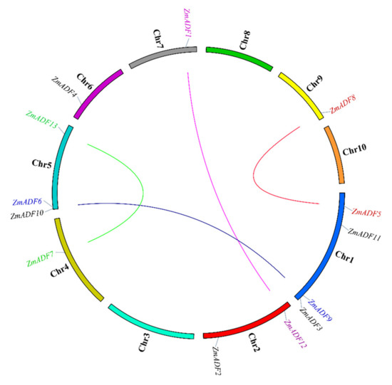 Gene duplication events of ZmADFs. The segmentally duplicated genes are linked by different color lines.