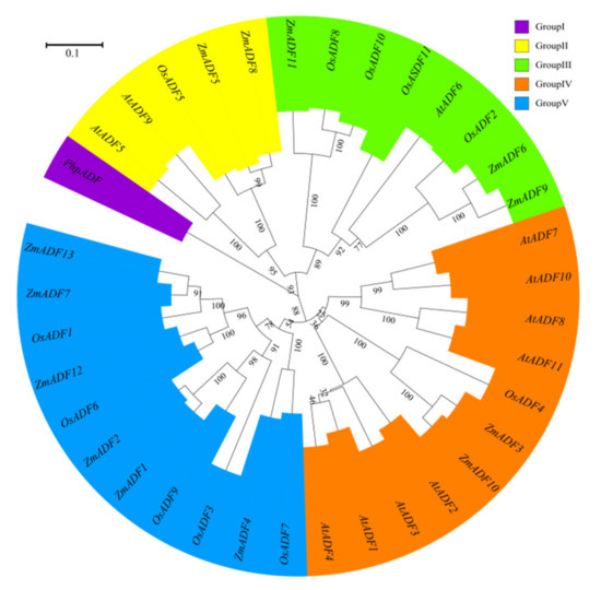 In addition to the PhpADF (group Ⅰ), the phylogenetic tree classified the ADF proteins into four main groups (group Ⅱ, Ⅲ, Ⅳ, V), consistent with published data of rice, Arabidopsis, and tomato [7,11]. In the phylogeny (Figure 4), group V included the largest numbers of ZmADFs proteins (ZmADF1/2/4/7/12/13), and five OsADFs also belonged to this group. Group IV also contained 11 members, including eight AtADFs, two ZmADFs (ZmADF3/10), and one OsADFs, followed by group Ⅲ, which included three numbers of ZmADFs (ZmADF6/9/11). Group Ⅱ only contained five ADF members, including ZmADF5 and ZmADF8 in this clade.
