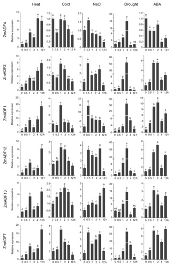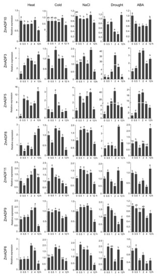 Relative expression levels of ZmADFs under heat (40 °C), cold (4 °C), salinity (0.2 M NaCl solution), drought, and abscisic acid (0.1 mM ABA) treatments in maize. qRT-PCR was used to study the expression level of 13 ZmADF genes. The internal reference gene is ZmActin. Three independent experiments were conducted. The abscissa represents the time point after stress treatment. Vertical bars indicate the standard error of mean. Small letter(s) above the bars indicated significant differences (p < 0.05, Duncan) between time stages.