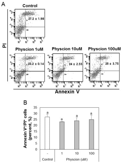 Physcion was not cytotoxic to bone-marrow-derived dendritic cells (BMDCs). (A) Cell death analysis by flow cytometry. Late-stage apoptotic cells are presented (Annexin V-FITC positive and PI positive). (B) Calculated apoptotic rates (%) of late stage apoptotic cells. Experiments were repeated twice. a: different letters indicate significant differences (p < 0.05) as determined by one-way ANOVA with Duncan’s multiple-range test.