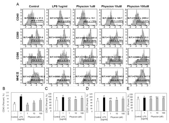 Physcion increased the expressions of surface molecules and MHCIIon BMDCs. (A) Histograms show percentages and mean fluorescence intensities (MFIs) of CD11c + CD40 +, CD11c + CD80+, CD11c + CD86+, and CD11c + MHCII+ cells. Bar graphs show calculated percentages of (B) CD11c + CD40+, (C) CD11c + CD80, (D) CD11c + CD86, and (E) CD11c + MHCIIcells. Experiments were repeated twice. a, b, c, and d: different letters indicate significant differences (p < 0.05) as determined by one-way ANOVA with Duncan’s multiple-range test.