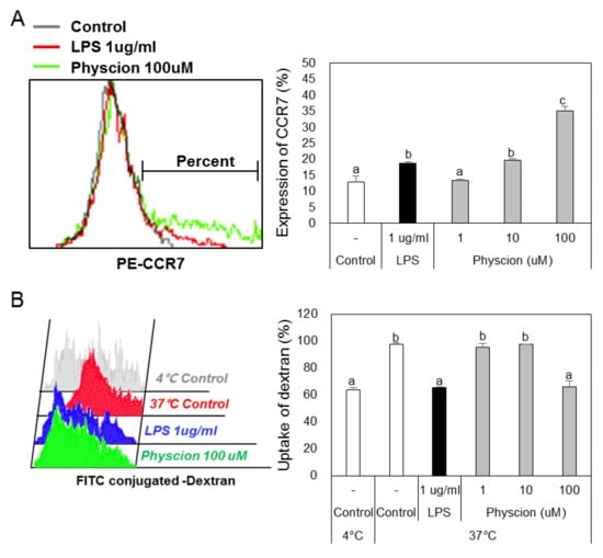 To determine if physcion induces maturation, we assessed the levels of the BMDC maturation markers CD40, B7 (CD80 and CD86), and MHC II (major histocompatibility complex II) (Figure 2A) using LPS as a positive control. CD40 levels were significantly and concentration-dependently increased by physcion versus non-treated controls (Figure 2B), and expressions of CD80 (Figure 2C), CD86 (Figure 2D), and MHC II (Figure 2E) were also significantly increased by physcion at 10 and 100 μM. In addition, CCR7 expression, which is involved in DCs movement, was significantly increased by LPS or physcion (Figure 3A). Moreover, endocytic activity (an active marker of mature DCs) was assessed by exposing cells to dextranfluorescein isothiocyanate (FITC). Double-positive cell (CD11c+ and dextran-FITC-positive) numbers were decreased by physcion or LPS, indicating that functional maturity was enhanced (Figure 3B). These results show that physcion increased the expressions of the co-stimulatory molecules required to produce activated CD4+ T cells from DCs and enhanced functional maturity.