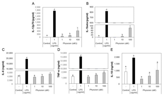 Physcion increased cytokine secretions by BMDCs. ELISA analysis of the cytokines, (A) IL-12p70, (B) IL-1 beta, (C) IL-6, (D) TNF-α, and (E) IL-10, secreted by LPS or physcion-treated BMDCs. Experiments were repeated twice. a, b, c, and d: different letters indicate significant differences (p < 0.05) as determined by one-way ANOVA with Duncan’s multiple-range test.