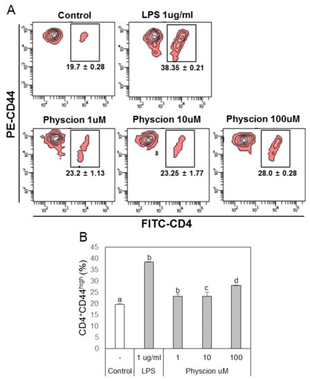 Physcion-treated BMDCs induced the differentiation of effector T cells (CD4 + CD44high cells). (A) Representative dot plots of CD4 + CD44high cells obtained from CD4+ T cells co-cultured with physcion-treated BMDCs. (B) Bar graphs indicate calculated percentages of CD4 + CD44high cells. Experiments were repeated twice. a, b, c, and d: different letters indicate significant differences (p < 0.05) as determined by one-way ANOVA with Duncan’s multiple-range.