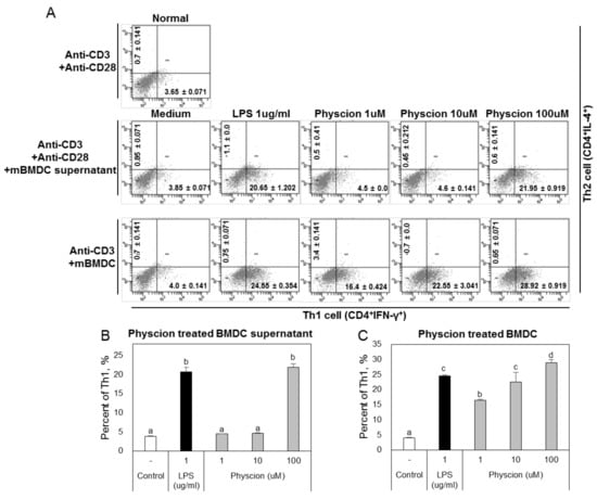 Physcion-treated BMDCs and their supernatants induced the differentiation of Th1 (CD4+ IFN-γ+) cells. (A) Representative dot plots of CD4+ IFN-γ+ and CD4+ IL-4+ cells of naïve CD4+ T cells co-cultured with physcion-treated BMDCs. Percentages of Th1 cells that differentiated from naive CD4+ T cells cultured with (B) physcion-treated BMDCs or (C) their supernatants. Experiments were repeated twice. a, b, c, and d: Different letters indicate significant differences (p < 0.05) as determined by one-way ANOVA with Duncan’s multiple-range test.