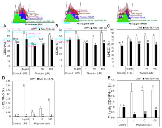 Blocking of TLR4 in BMDCs decreased surface molecule expression, cytokine production, and the Th1 cell population. Anti-TLR4 Ab treated or untreated BMDCs were incubated with physcion. Bar graphs shown calculated percentages of (A) CD11c + CD80+, (B) CD11c + CD86 +, and (C) CD11c + MHCII+ cells. (D) IL-12p70 levels were measured by ELISA and (E) Th1 cell populations were determined by FACS and are presented as CD4 + IFN- γ + cells percentages. Experiments were repeated twice. a, b, c, d, and e: Different letters indicate significant differences (p < 0.05) as determined by one-way ANOVA with Duncan’s multiple-range test.
